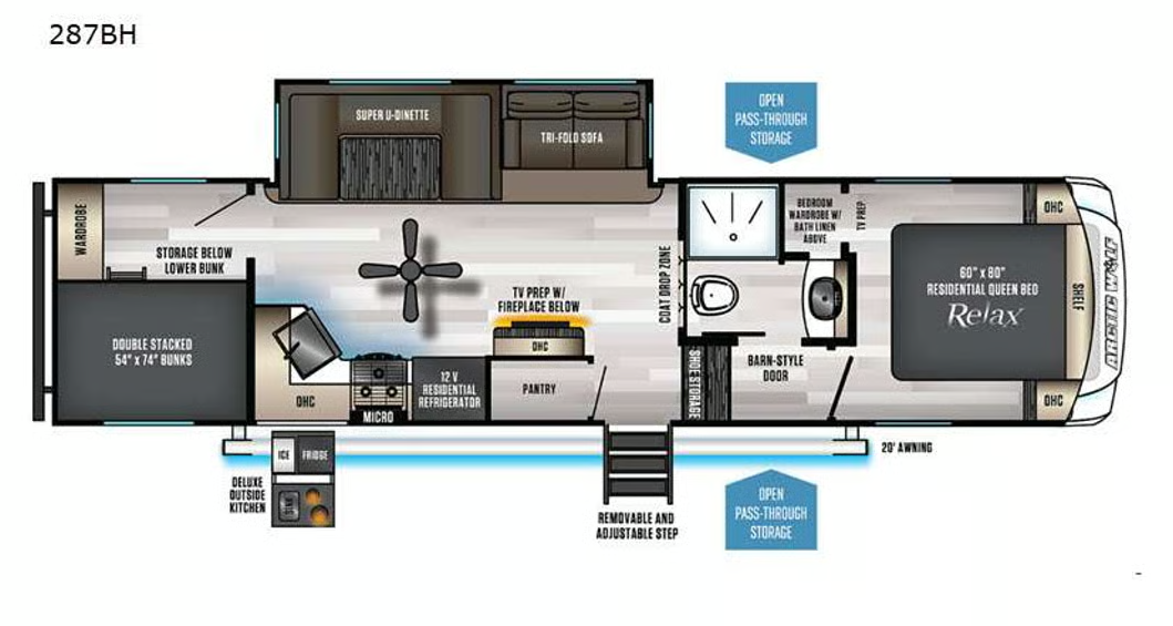 2021 fifth wheel is 35' long and has one slide out. Check out specs online for 287BH. Only available for delivery and pick up. This camper has it all, including outdoor kitchen (refrigerator, ice maker, stove top and grill), awning, outdoor shower. Inside has a TV, DVD player and stereo. Full kitchen, queen size main bed in upper bedroom, full size bunk beds in bunk room, U shaped dinette which turns into sleeper, couch that folds into bed, and full bathroom. Plenty of closet space and walk in pantry.